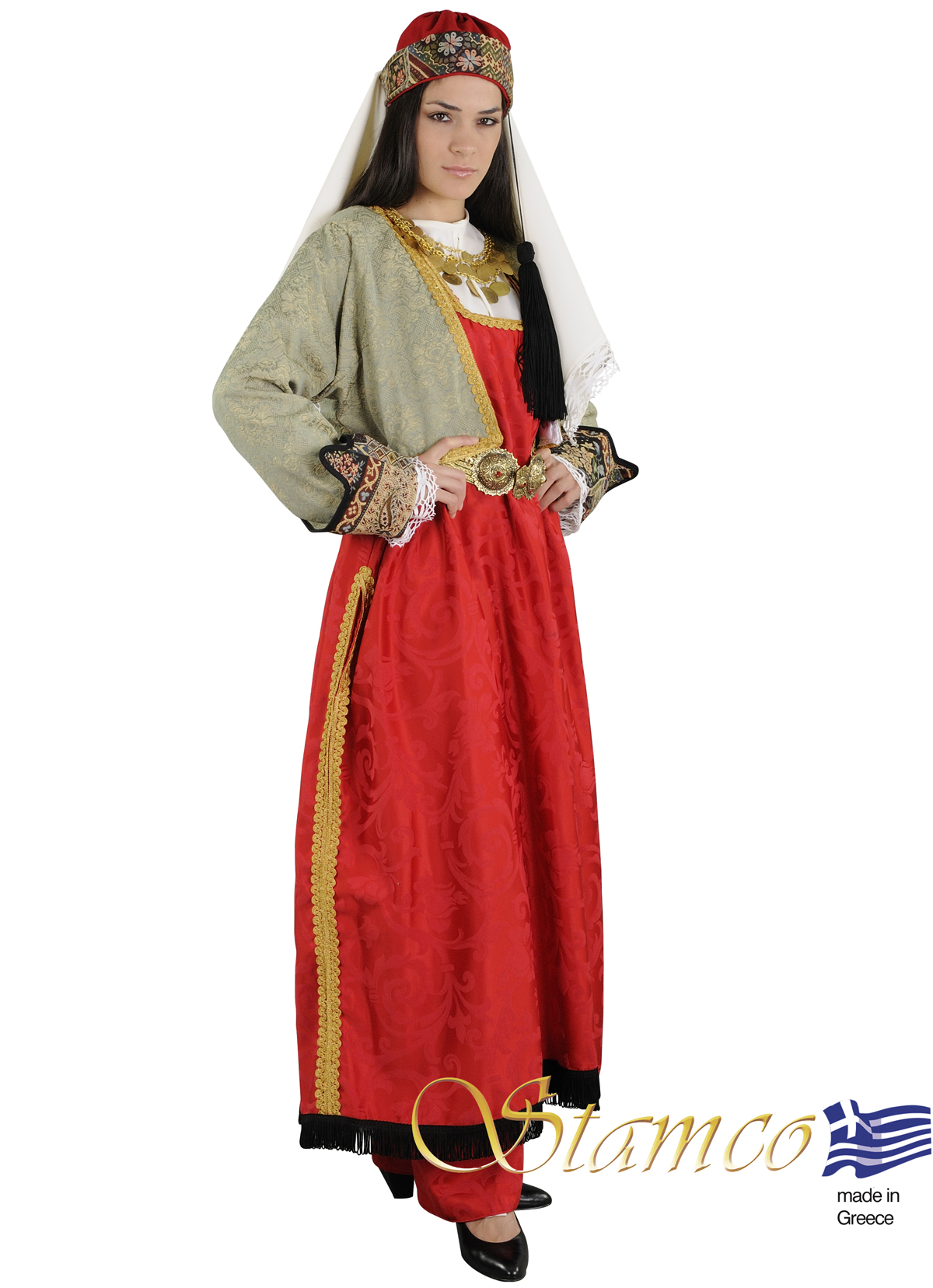 The Costume North Aegean Woman consists of : waistcoat , brocade dress , shirt , trousers , head piece buckle & necklace are sold separately