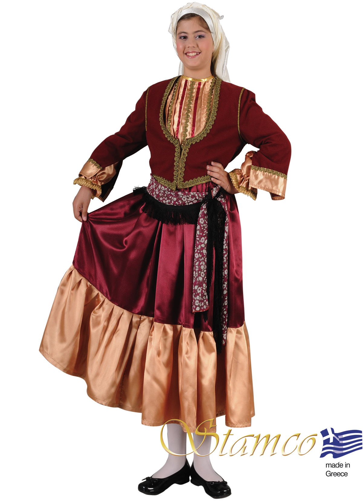 The Costume Aegean Island Girl consists of : vest , dress , sash , head scarf