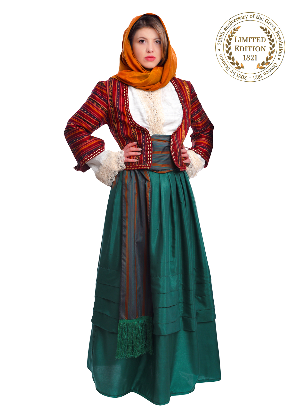 The Greek costume of Bouboulina consists of: brocade jacket, shirt with lace, skirt, striped belt for the waist and a headscarf.