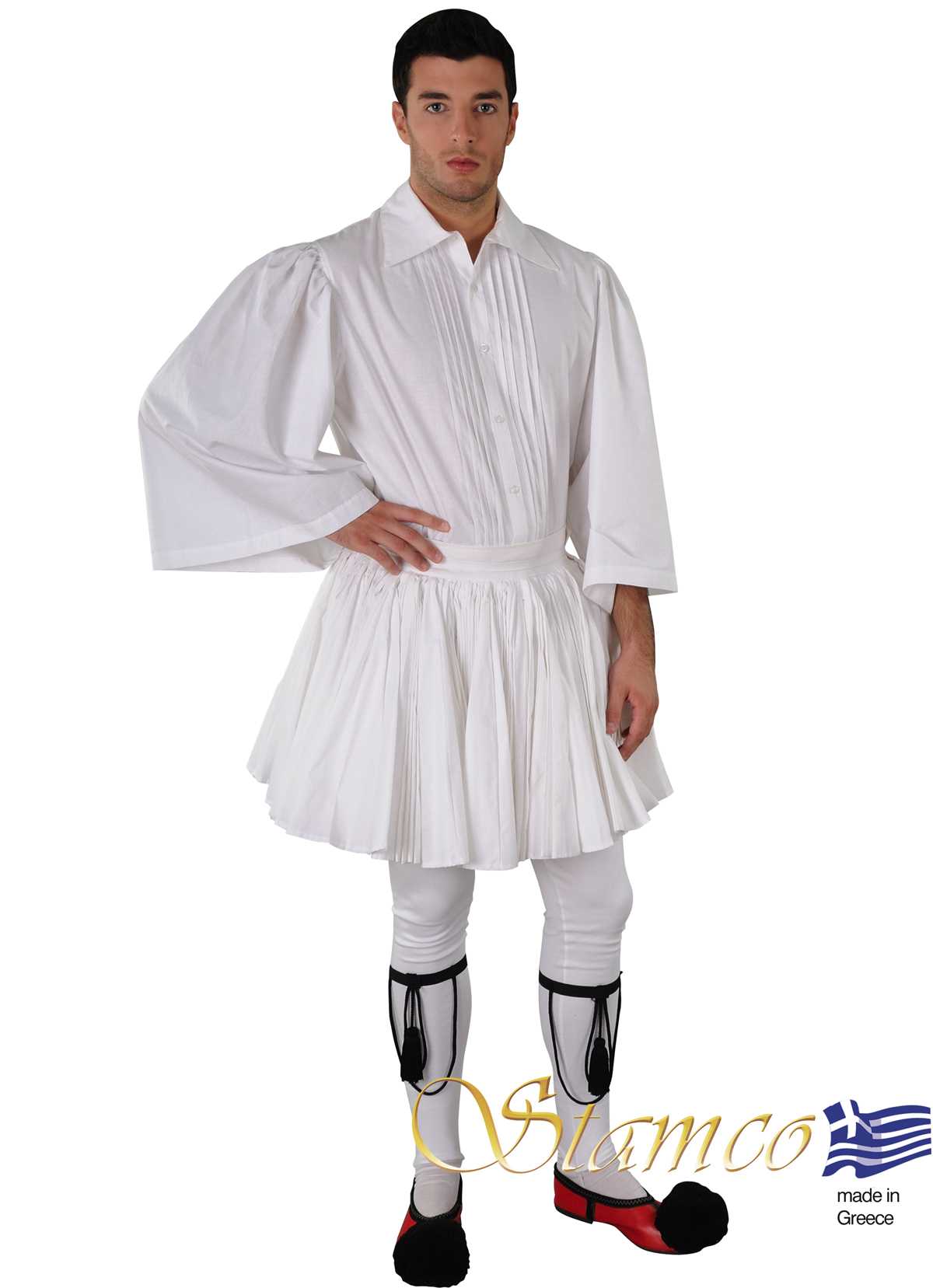 The Costume Fustanella 400Pleats consists of : typical shirt, elastic trousers, knee bands (gonatoures) and fustanella with 400 pleats the lenght of the skirt is 50 cm (on demand the lenght could be 35cm or 65cm). Tsarouchia are sold separately.