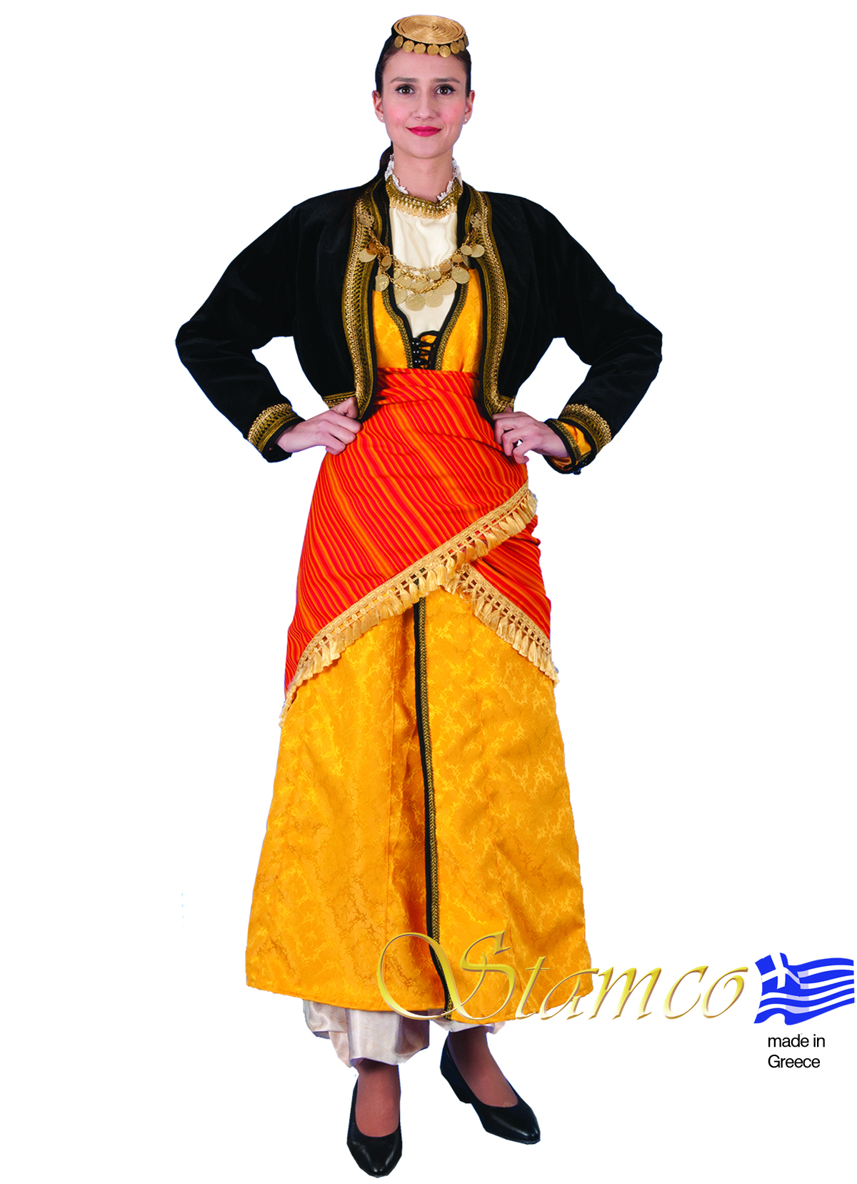 The Costume Pontos Woman consists of: velvet vest, dress chestcover, traditional trousers (salvari) , waist scarf , typical hat with coins , the neclace are sold separately