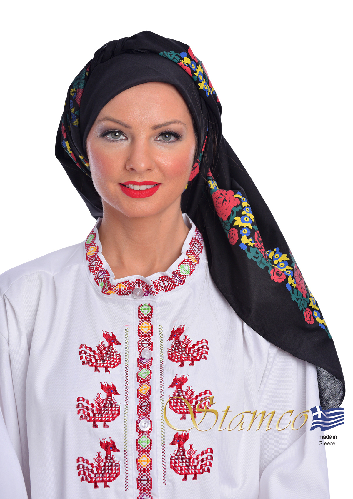 Greek Cotton Black Scarf with printed flowers.