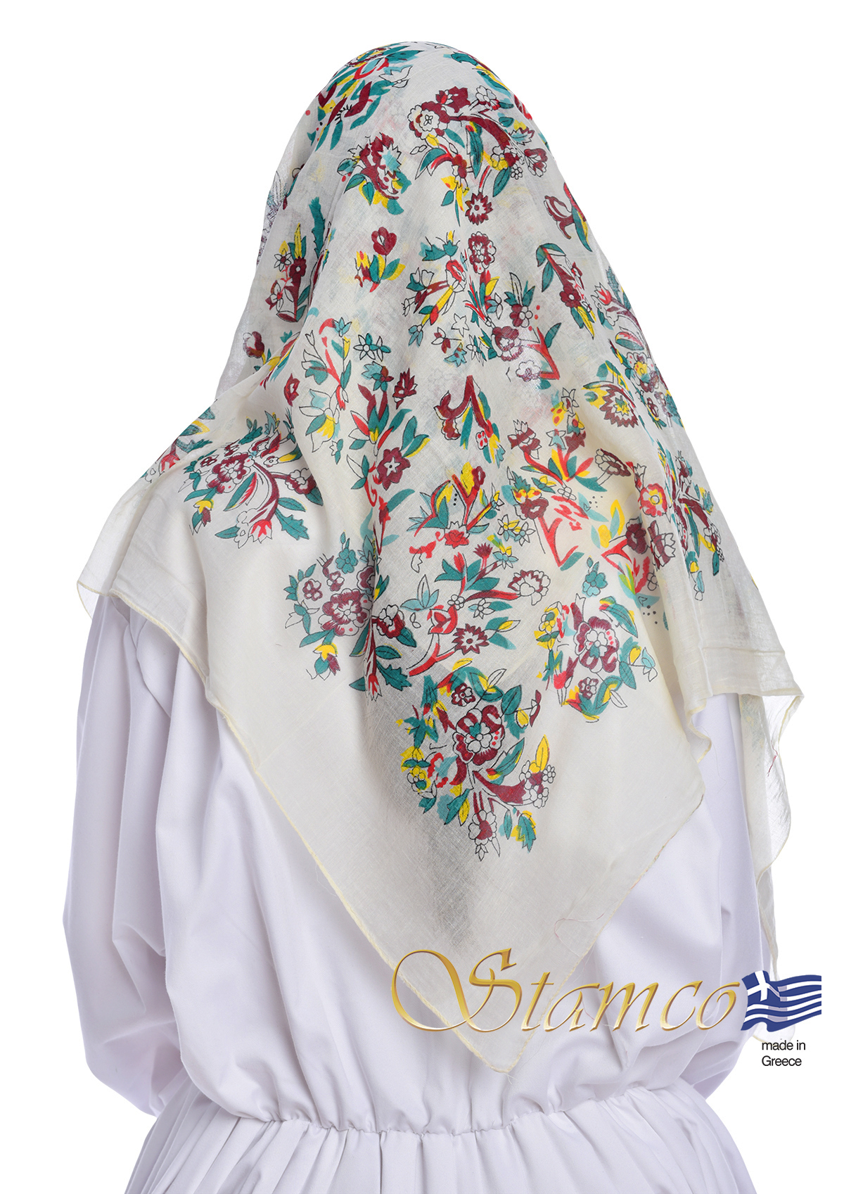 Greek Cotton white scarf with printed colourful flowers from Attica - Αthens. An ideal accessory for all women's and children's greek costumes and can be worn for any dance event.
