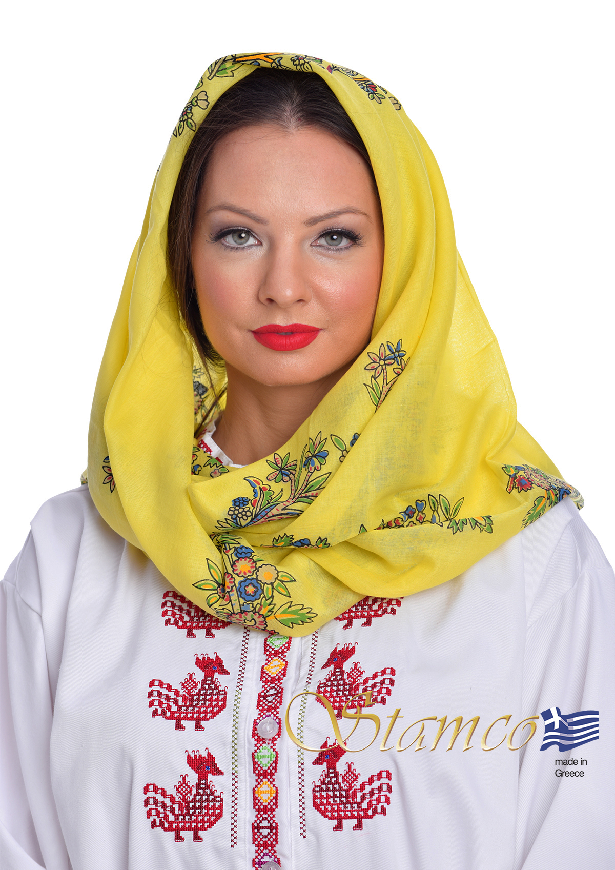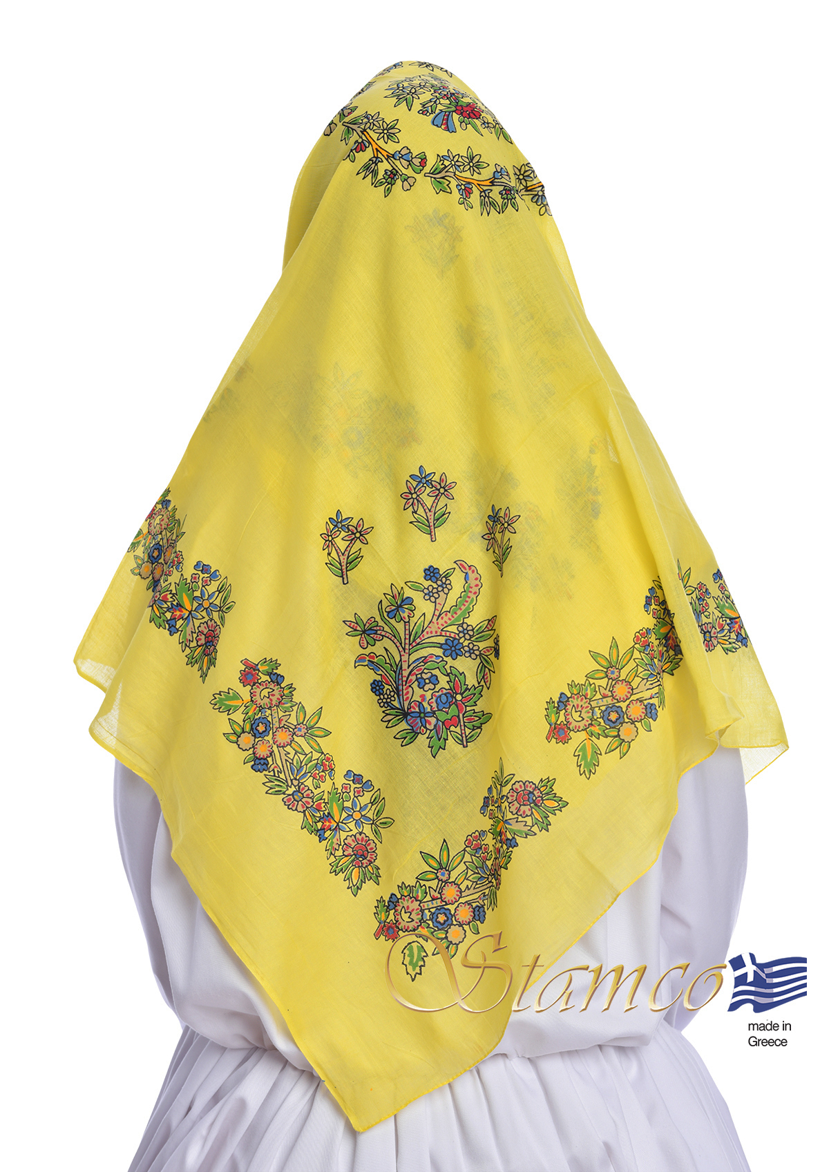 Greek Traditional Cotton yellow Scarf with printed flowers from Salamina and Nafpaktos.