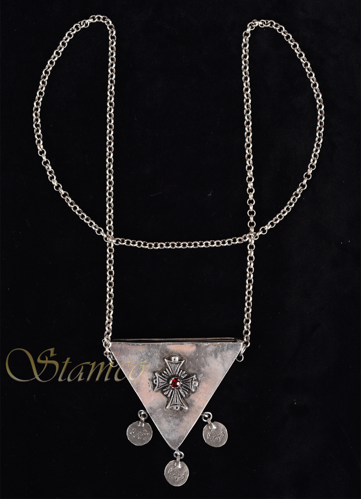 A very beautiful silver piece of jewelry in a triangular shape. On the face it has the Cross with a red stone while it is completed by a long chain and 3 silver coins