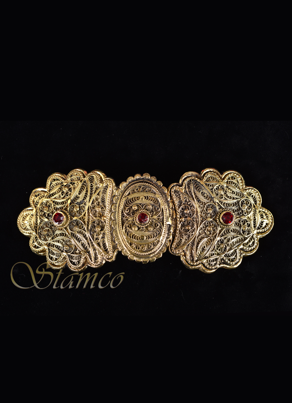 This beautiful gold buckle is decorated with 3 red stones and has small hooks inside for better and more stable fit on the costume.